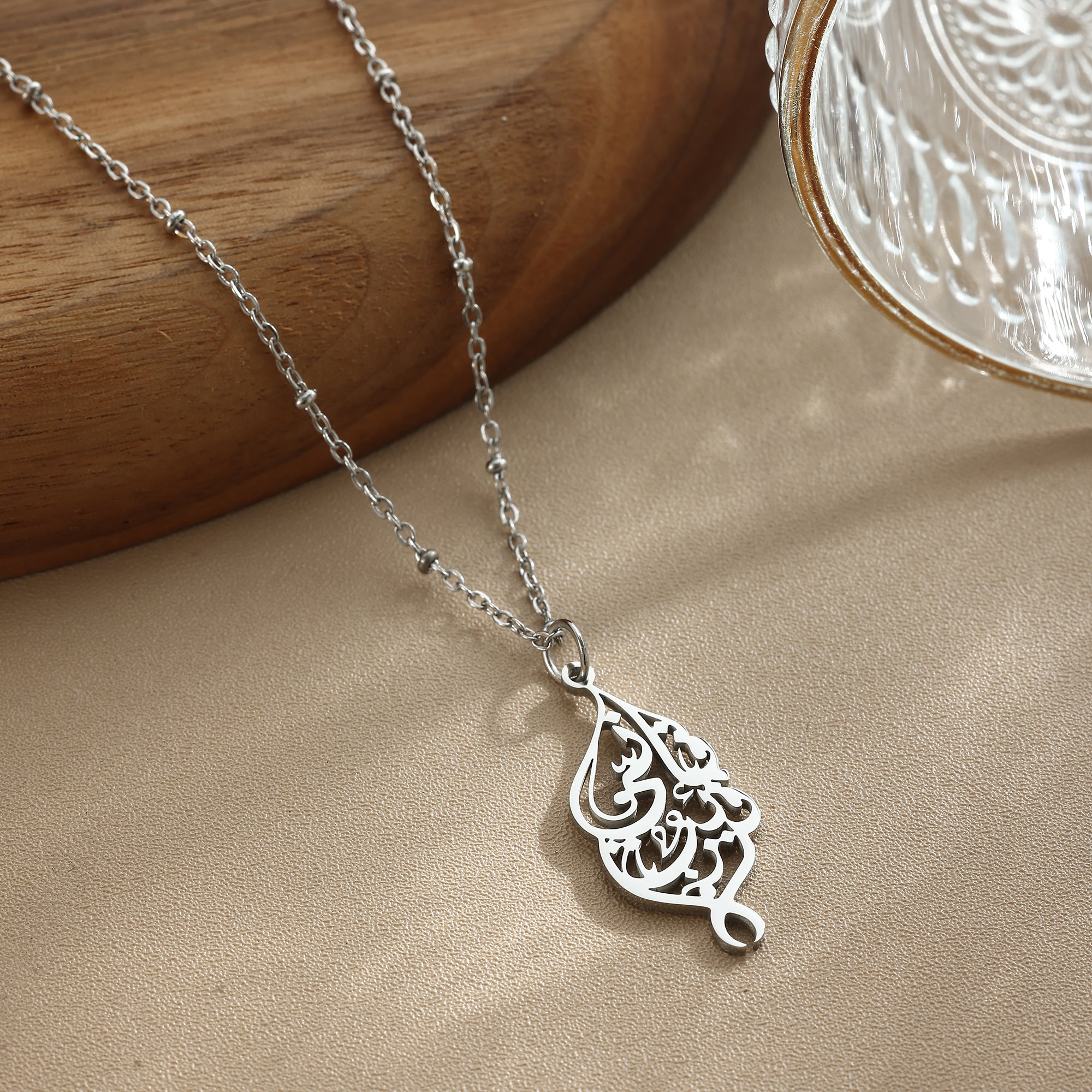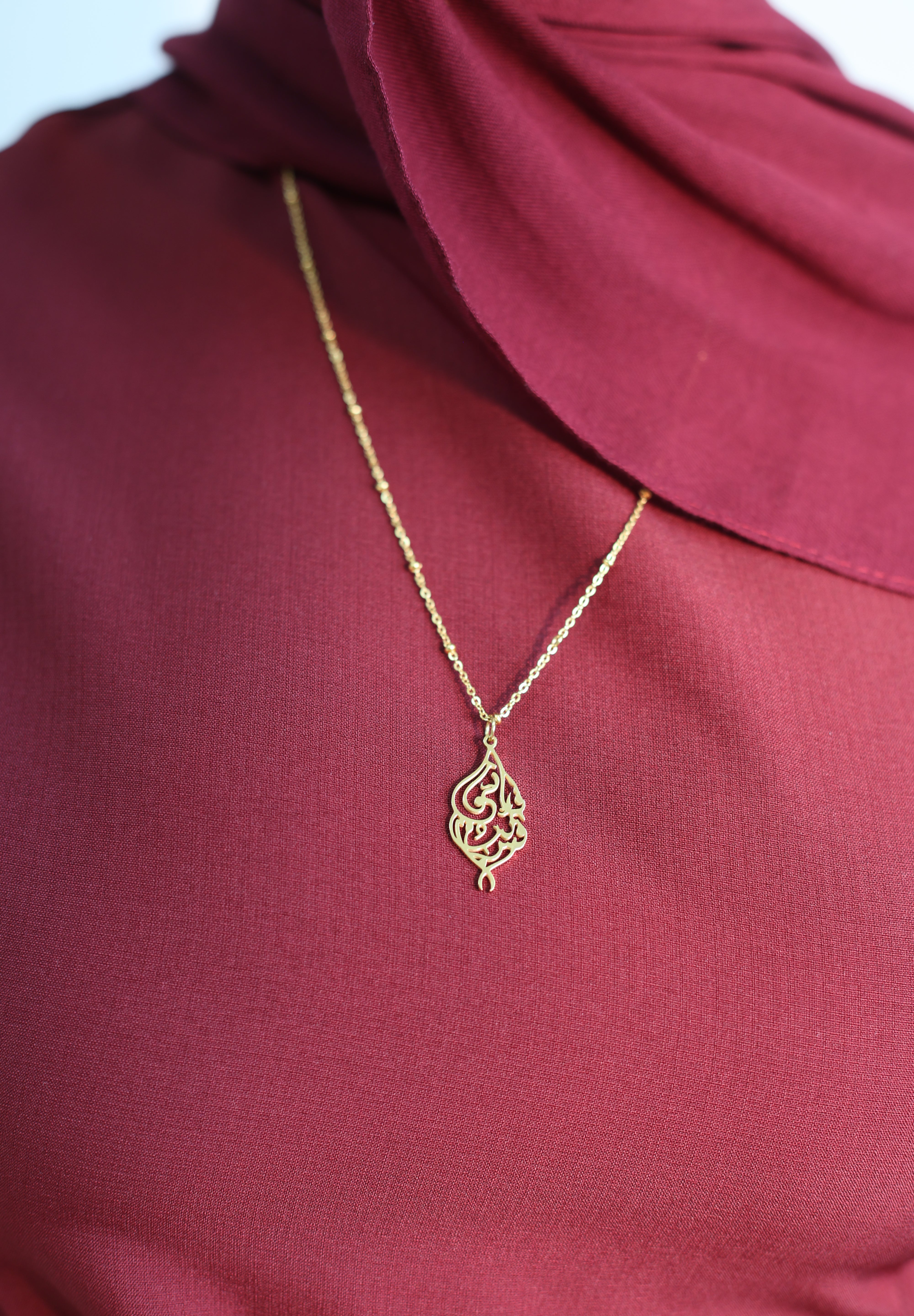 This elegant necklace features beautiful Arabic calligraphy and a Quran verse, serving as a constant reminder that Allah is always near. Expertly crafted with a lovely design, it's the perfect accessory for any Muslim. Stay connected to your faith with this meaningful piece.